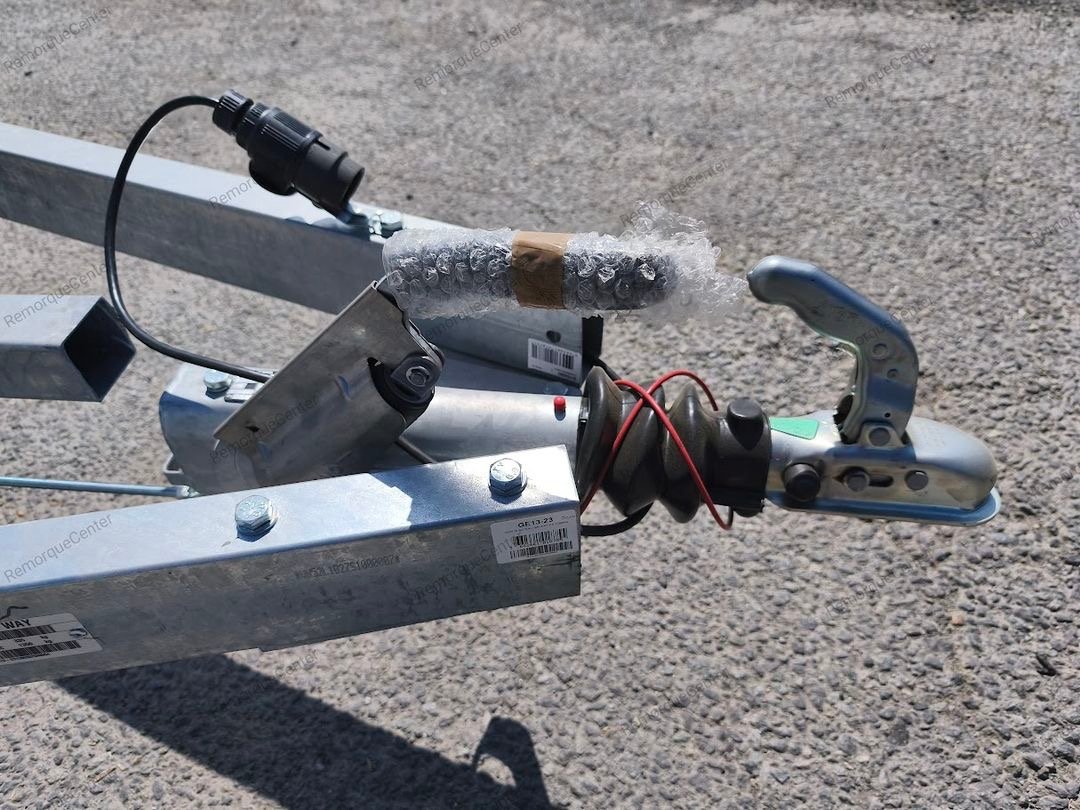 La remorque est équipée de feux fixes LED étanches, garantissant une visibilité optimale et une durabilité accrue, même en conditions humides en bord de mer. Son essieu freiné ALKO de 1350 kg assure une stabilité et une sécurité renforcées lors du transport.