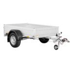Une fermeture sécurisée est intégrée au système de ridelles, empêchant toute ouverture accidentelle durant le transport. Des crochets de remorquage viennent compléter cet ensemble, renforçant l’aspect pratique et fiable de cette remorque.