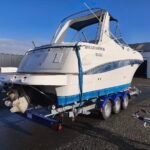 Einachsiger ungebremster SUNWAY-Anhänger, ausgelegt für Boote bis 4,70 m. Zulässiges Gesamtgewicht bis 750 kg. Ausgestattet mit wasserdichten LED-Leuchten, 450-kg-Winde, Teppichrampen, Ölbadnaben und verstellbarem Anschlag mit Polstern.