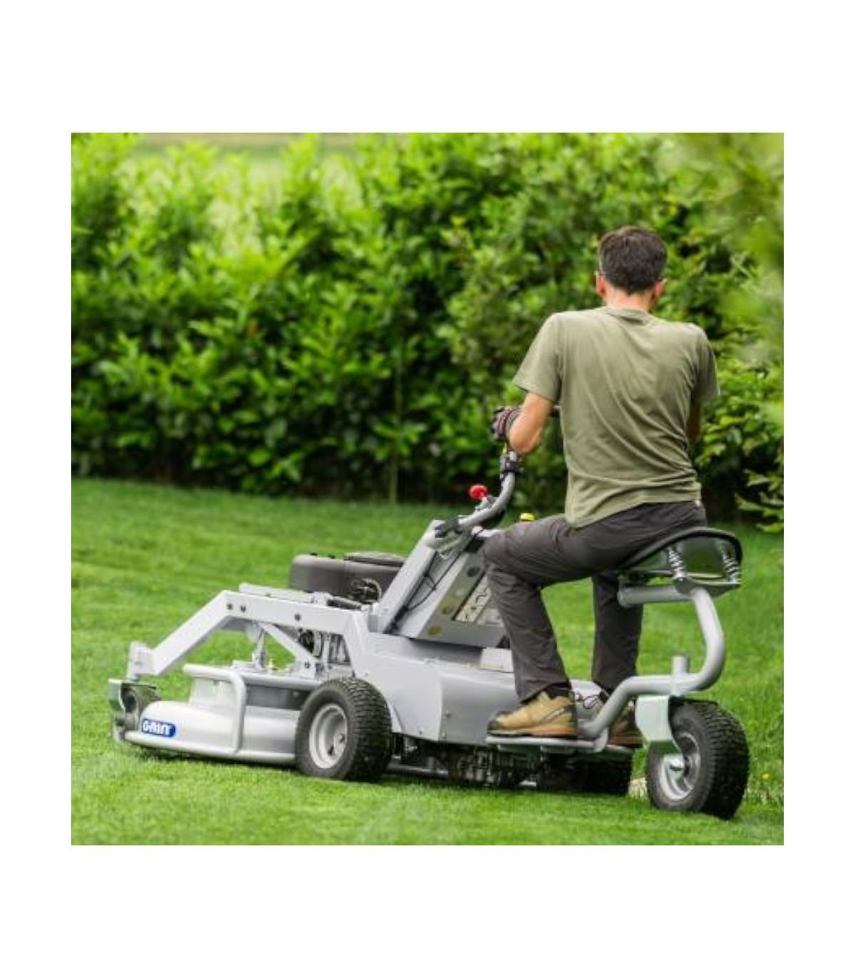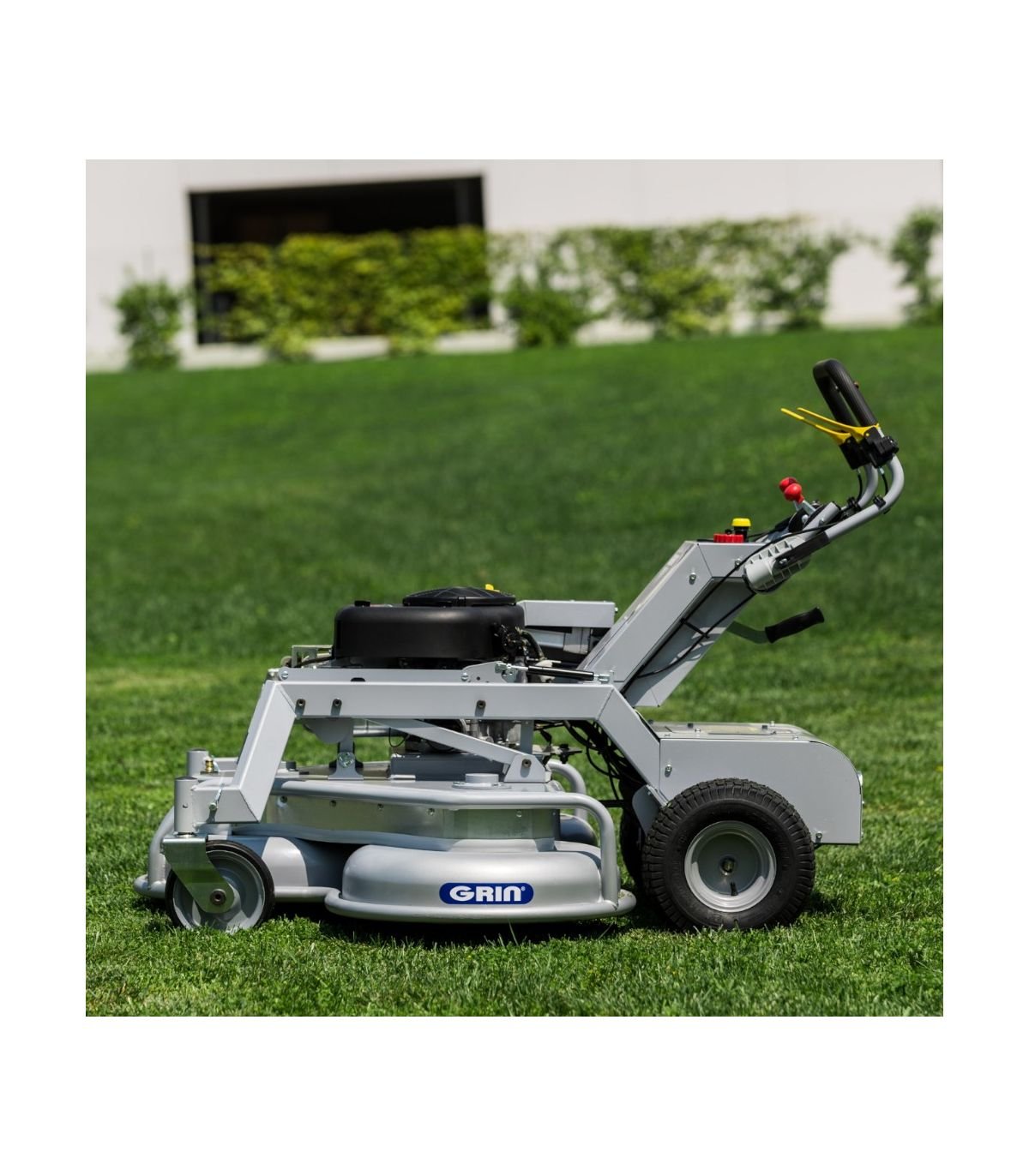 - Tondeuse professionnelle GRIN XM140A, conçue pour les grands espaces verts de 3000 m² et plus avec une capacité de tonte de 8.100 m²/h et une largeur de coupe de 140 cm.