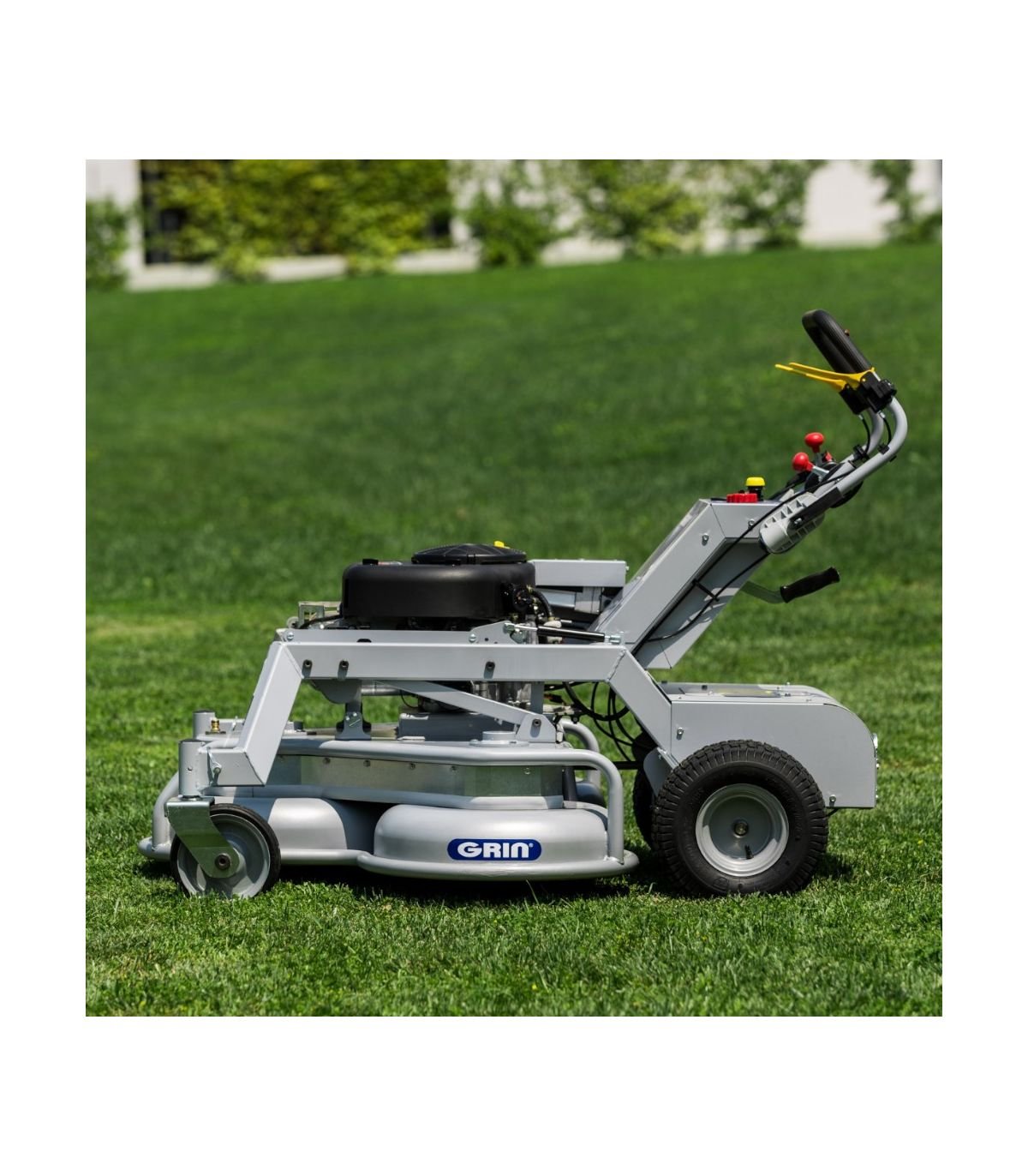 - Tondeuse professionnelle GRIN XM120A, idéale pour l’entretien des grands espaces verts de 3000 m² et plus, avec une capacité de tonte de 7.000 m²/h et une largeur de coupe de 120 cm.