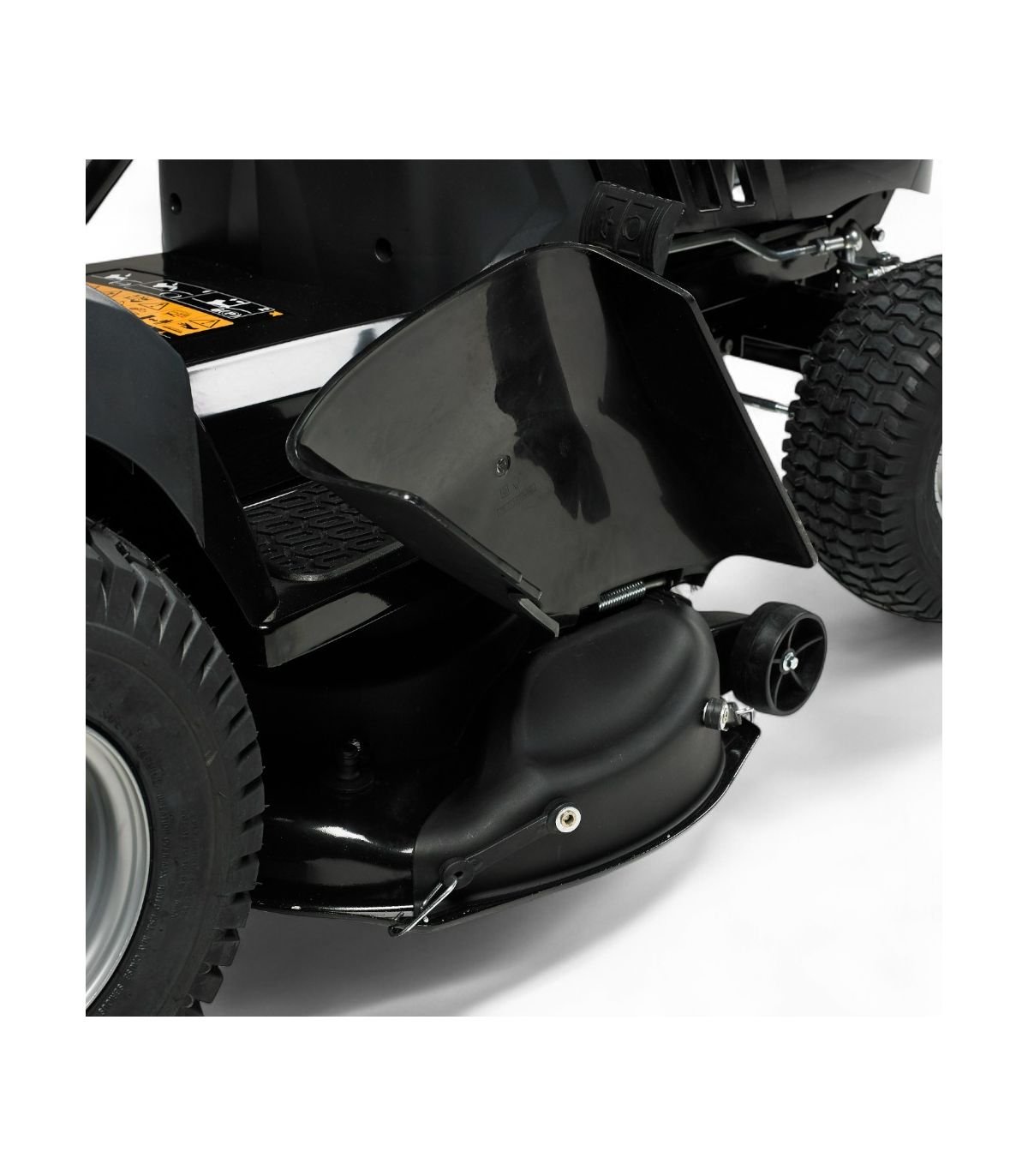 Le plateau de coupe de 98 cm est équipé de deux lames métalliques robustes. Le système de coupe permet une éjection latérale des débris ou un paillage intégré (mulching inclus). La hauteur de coupe est réglable en 7 positions, de 30 mm pour une tonte courte jusqu’à 90 mm pour les herbes hautes. Le plateau est en acier massif pour une meilleure résistance aux chocs.